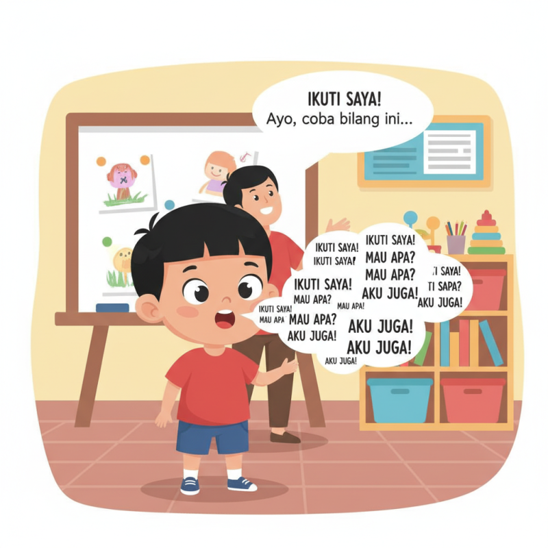 - Modelkan Bahasa yang Fungsional: Ketika anak membeo, coba modelkan respons yang tepat. Misalnya, jika anak mengulang "Mau makan?", Anda bisa merespons dengan "Ya, aku mau makan" atau "Makan apa?". Ini membantu anak mengasosiasikan ucapan dengan respons yang relevan.
